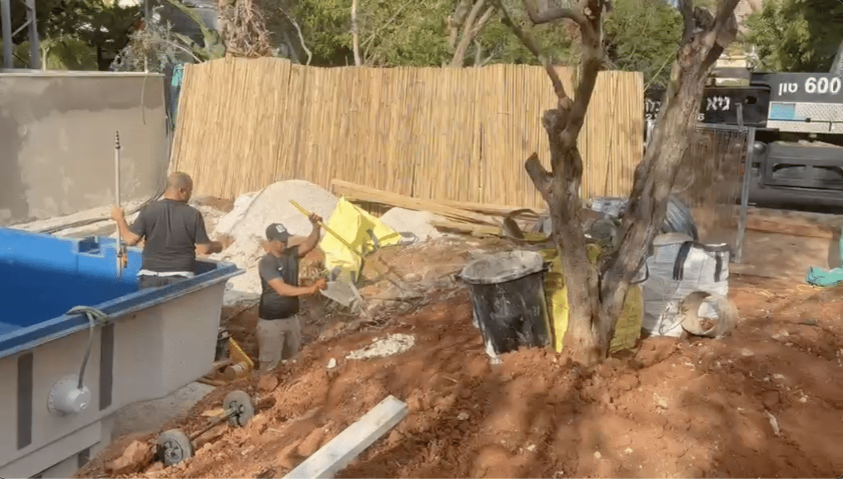 הבריכה ממולאת במים והסביבה מעוצבת בהתאם לרצונות הבעלים